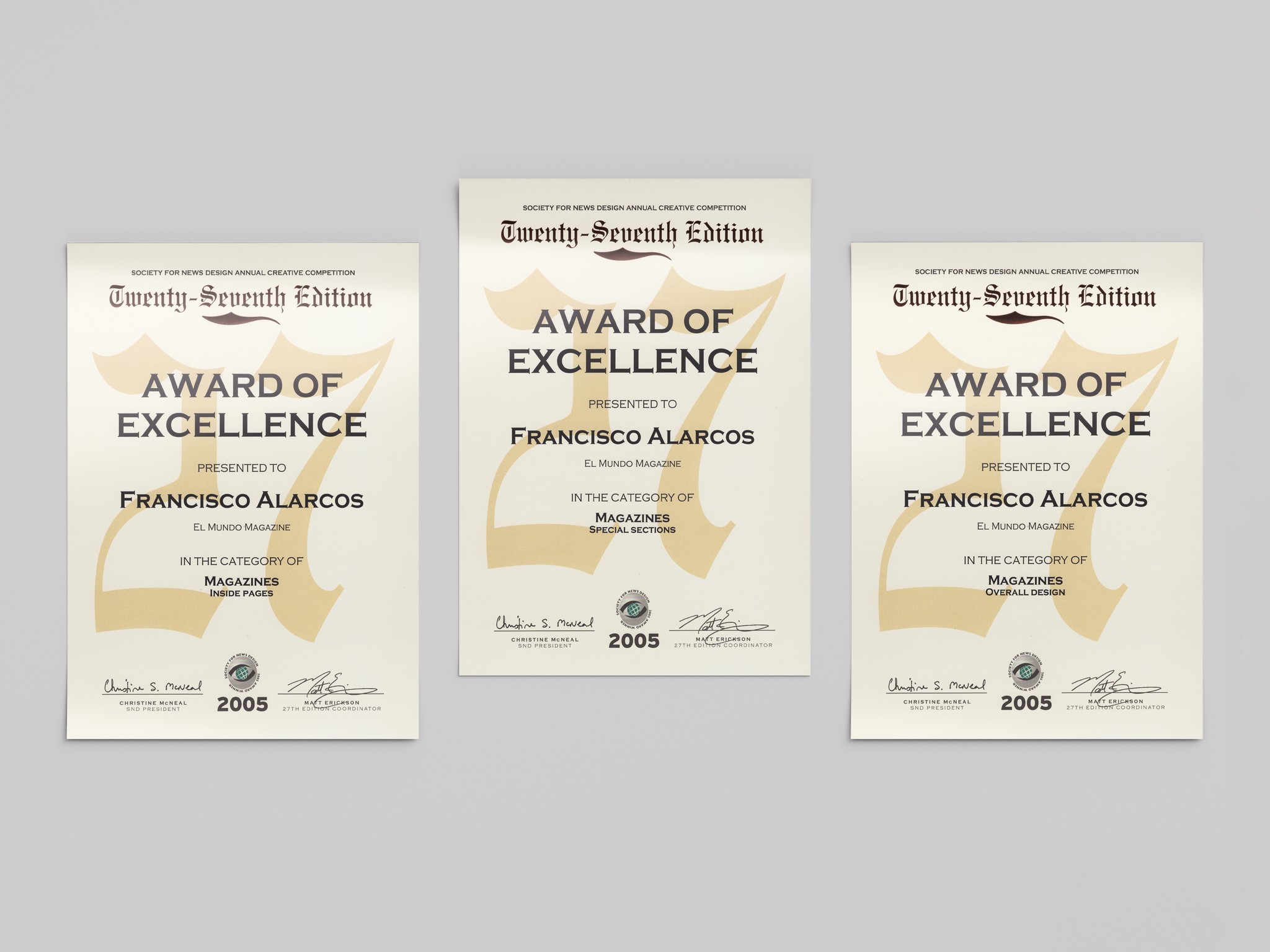 Los premios de la Society for News Design (SND) reconocen la excelencia en el diseño periodístico a nivel mundial. Este concurso anual destaca trabajos sobresalientes en la presentación visual de noticias, incluyendo diseño de periódicos, revistas, sitios web y otros formatos multimedia. Los galardones abarcan diversas categorías, desde diseño de portadas hasta infografías, promoviendo la innovación y la calidad en la narrativa visual en el periodismo.
