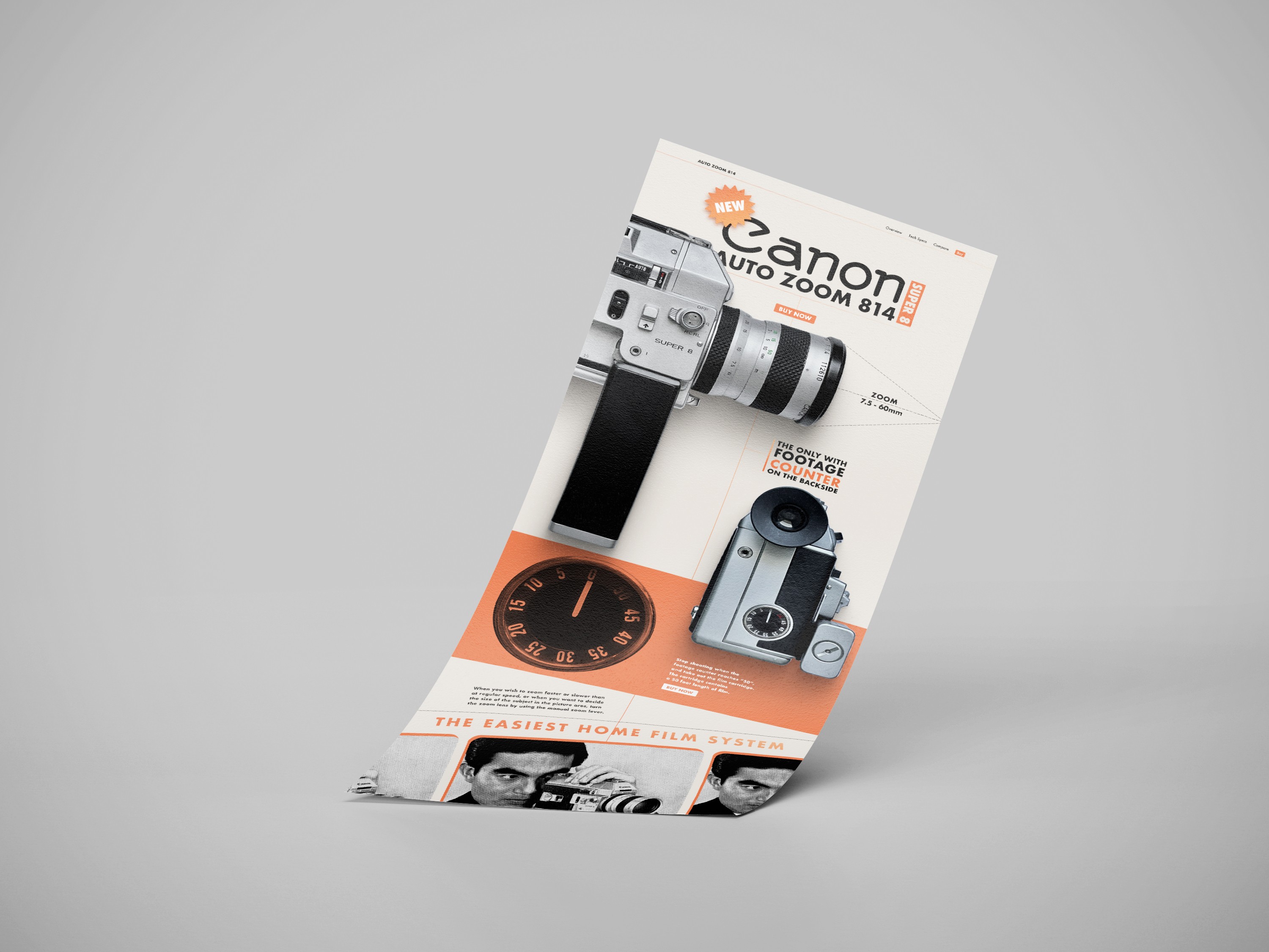 Diseño de una Landing Page dedicada a la Canon Super 8 Auto Zoom 814. Este diseño te transporta a una época en la que la internet apenas comenzaba a florecer, pero conservando ese toque retrofuturista que solo la década de 1970 podría ofrecer. Los colores cálidos y los tonos terrosos evocan una sensación acogedora, mientras que los elementos gráficos y la tipografía vintage añaden un aire de autenticidad y nostalgia.
